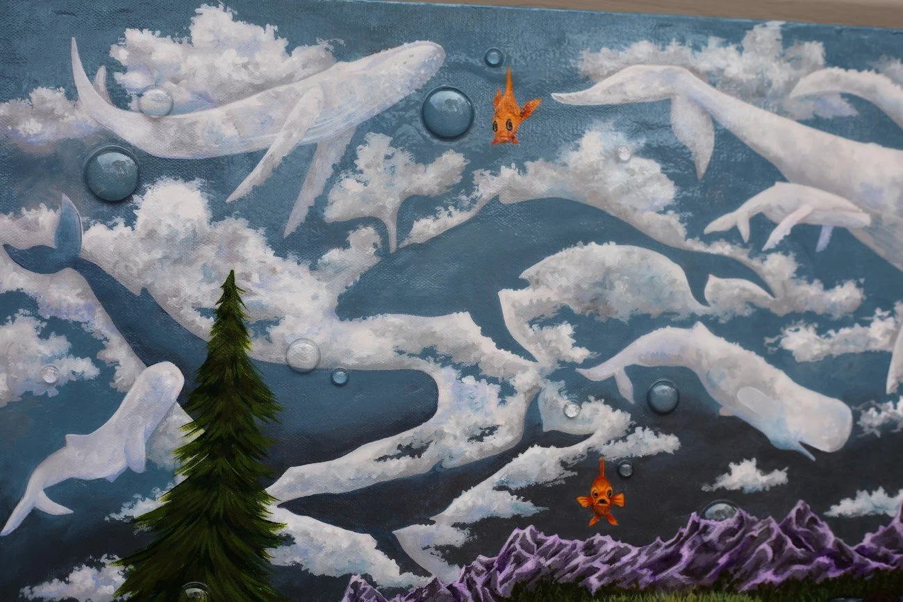 This painting came from a dream I had years ago. I was wandering through a huge room filled with artwork, and this exact piece was hanging on the wall. The positive and negative whales floating in the sky. The tiny orange fish swimming towards me. The thick, glossy shine over the entire surface. It was all there, waiting for me to catch up.